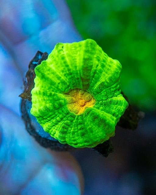 🚀👾 Space Invader Pectinia 👾🚀 Glowing neon green, blazing yellow eyes, and alien ridges that make this coral look straight out of another galaxy. A true showpiece that takes over the spotlight under blues.