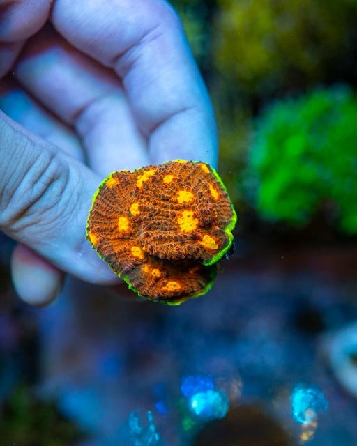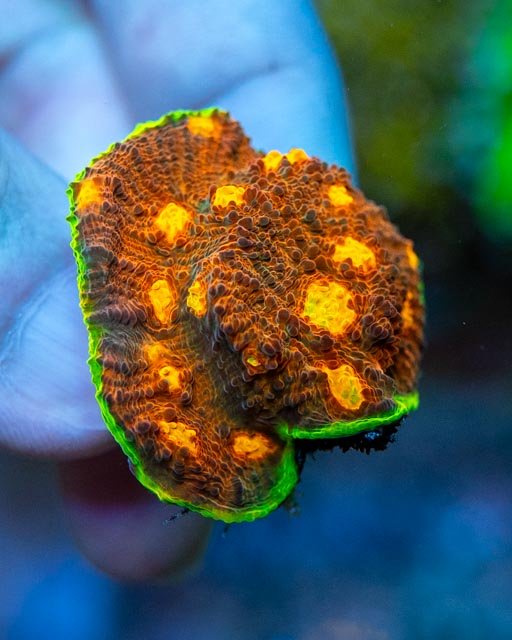 The MAI Miami Chalice is a show-stopping piece for any reef. Its vibrant neon green base is contrasted by fiery red eyes and subtle blue to purple streaking, giving it a true “Miami Vice” glow under actinic lighting. Known for its intense fluorescence and striking color separation, this chalice is highly sought after by collectors and adds a bold pop of color to any display. Like most chalices, it thrives best in low to moderate light with gentle flow, allowing its tissue to expand and show off its vivid patterns.